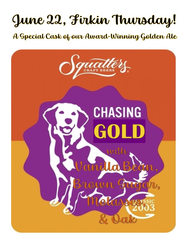 Our 6/22 firkin is Chasing Tail Golden Ale with vanilla bean, brown sugar, molasses, and oak.